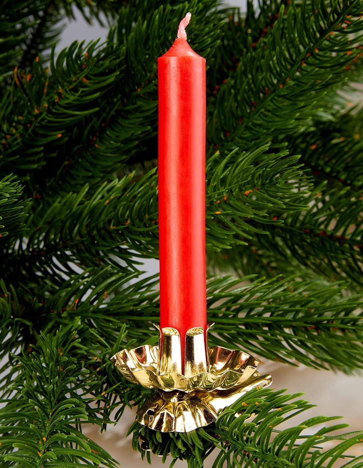 Traditional tree candle holders for your Christmas tree! Celebrate your Christmas in a traditional way and use real candles on your Christmas tree! Our classic candle holders will provide the perfect hold and add extra glow to your Christmas tree. Easy as pie to attach! The practical candle holders in the shape of a tail can be opened extra wide to include even large branches. With the help of the ball joint between the drip guard and clip, the candle can be easily aligned. Which candles fit in these holders? Thanks to the adjustable spout, all classic tree candles with a diameter of 0.4 inches (1 cm) to 0.6 inches (1.5 cm) fit into these candle holders. Our recommendation: Discover our popular BRUBAKER tree candles to match these festive Christmas tree candle holders! They burn especially clean and smoke-free, are odorless and have a long burning time of about 1.5 h. With their pleasant and atmospheric flickering light, they are suitable for many occasions. Available in a variety of colors! Safety instructions: - Make sure that the flames have enough distance to the next branch. - Use drip-free candles if possible to avoid overflowing the candle plate. - Please do not let candles burn out. This will prevent the candle holder from turning black and you will have longer friends with your tree candle holders. - Adjust the candle spout so that the candle is firmly seated in the holder.