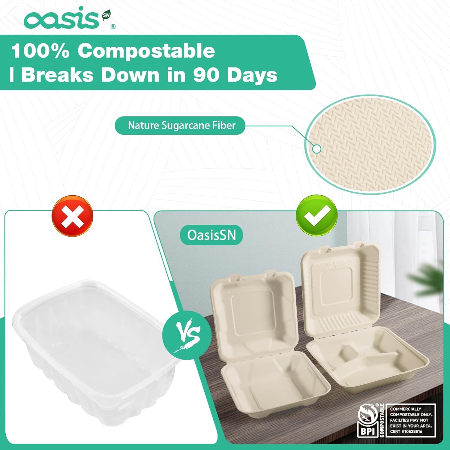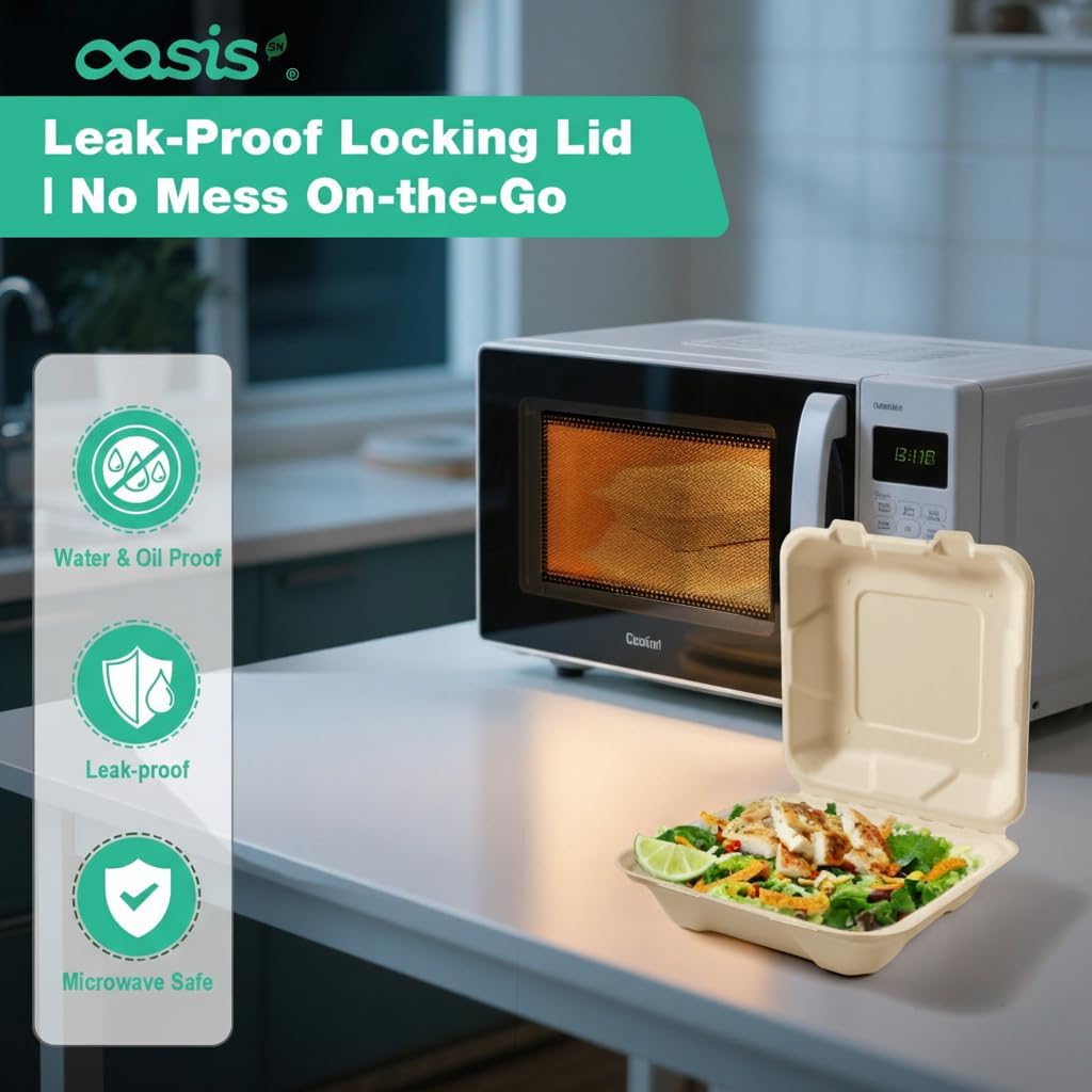 Upgrade your food service or home dining with OasisSN Compostable Clamshellsโthe sturdy, eco-friendly choice for hassle-free takeout and meal prep. Made from 100% bagasse, these containers deliver commercial-grade durability while staying 100% compostable (BPI Certified)โno plastic waste, just guilt-free convenience. Why Choose OasisSN? โ Strong & Leak-Resistant โ Holds saucy, greasy, or juicy foods without bending or spills. โ Microwave & Freezer Safe โ Reheat or store meals directly in the box. โ Versatile for Any Meal โ Burgers, BBQ, salads, or meal prepโserves it all. โ 68-Pack Smart Value โ Bulk savings for restaurants, food trucks, or families who want quality without excess waste. Perfect For: Restaurants & Catering โ Professional-grade takeout that impresses customers. Meal Prep & Parties โ Keep portions fresh and organized. Eco-Conscious Homes โ Ditch plastic without sacrificing convenience. Go Green with Every Meal โ With OasisSN, you get performance + sustainability in every bite.