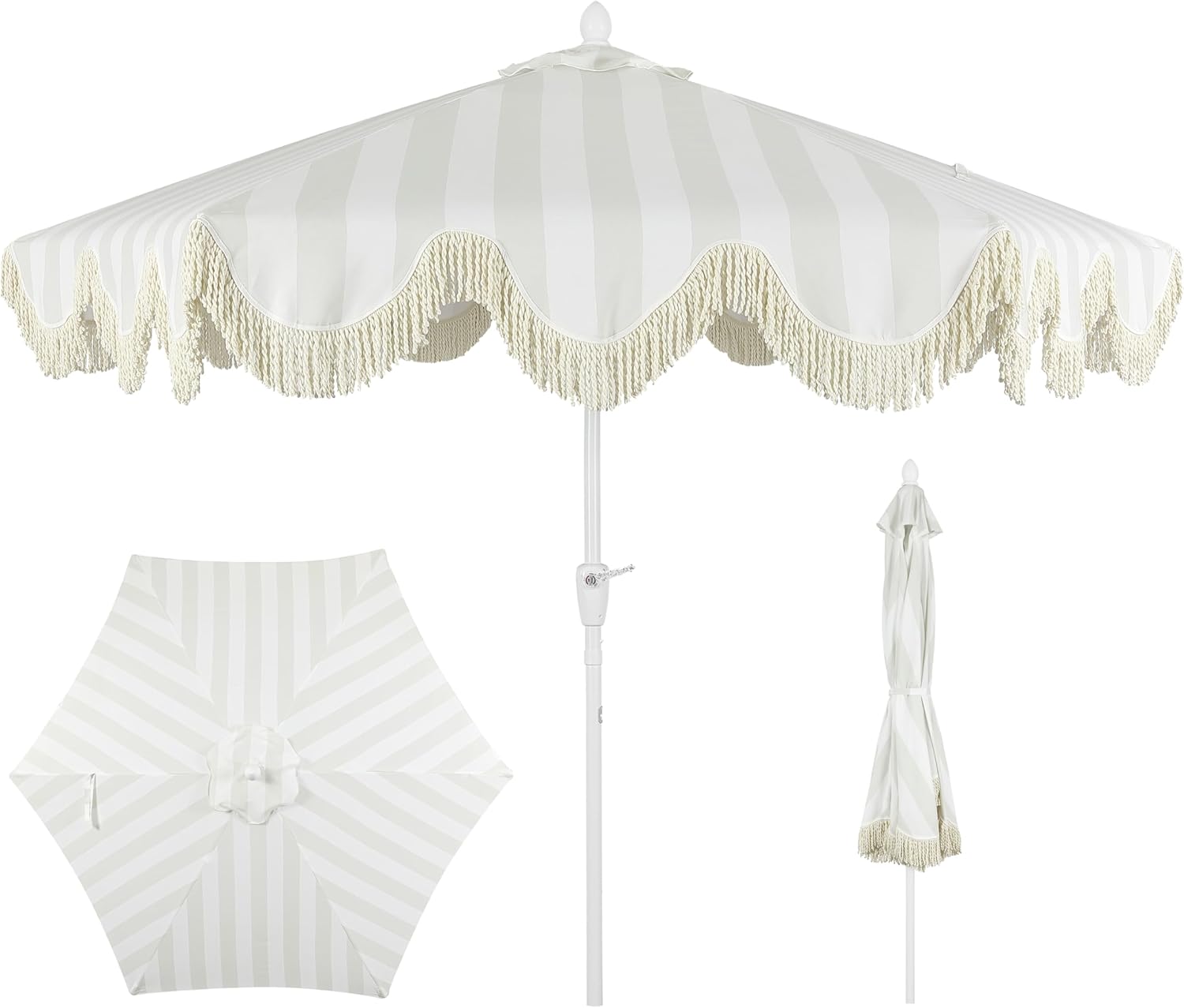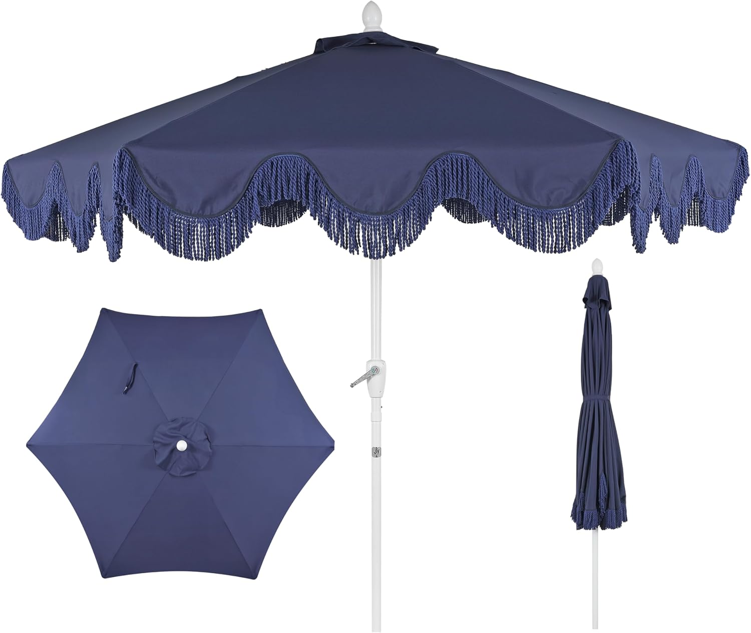 This lively cottage-style umbrella, adorned with fringe, brings joy to any gathering. Its robust aluminum frame, cloaked in tough outdoor canvas, features an automatic tilt function. With a scalloped edge and elegant fringe, it's ideal for patio or poolside cocktails.