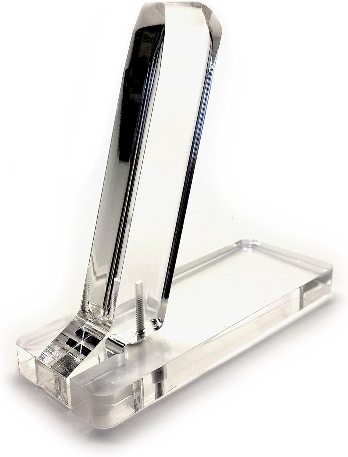 9mm double stack width clear acrylic display stand looks beautiful in gleaming rows inside your safe or in your gunshop display case! The slim footprint allows space saving placement in your safe or high density displays in your showcase. The highly polished clear acrylic neatly disguises the display into the background, allowing your pistol to shine! Minimum mag insertion width is 3/4", most common 9mm or larger double stack mag pistols should fit well. This display uses the common 1911 grip angle for highest universal fit, other brand pistols may have different grip angles producing different display angle results. One free hex wrench provided per order, more available upon request at the time of your order.